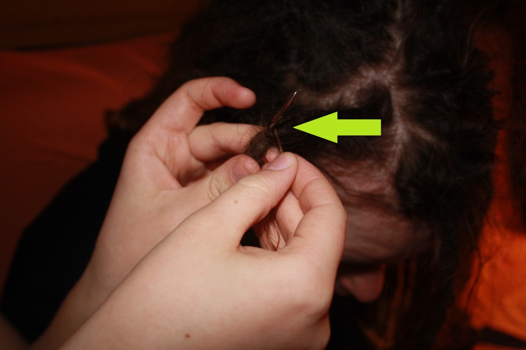 2.Mit der Häkelnadel so nah wie möglich am Ansatz durch den Dread stechen